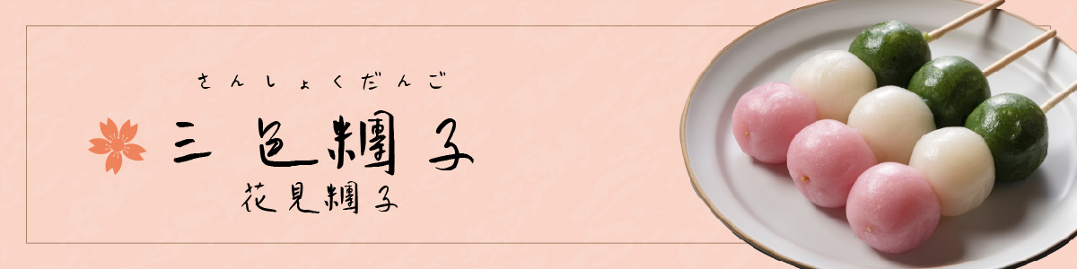 由粉、白、綠糰子串起。依序代表春天盛開的櫻花、暫別冬天的雪、迎接夏天的綠芽。