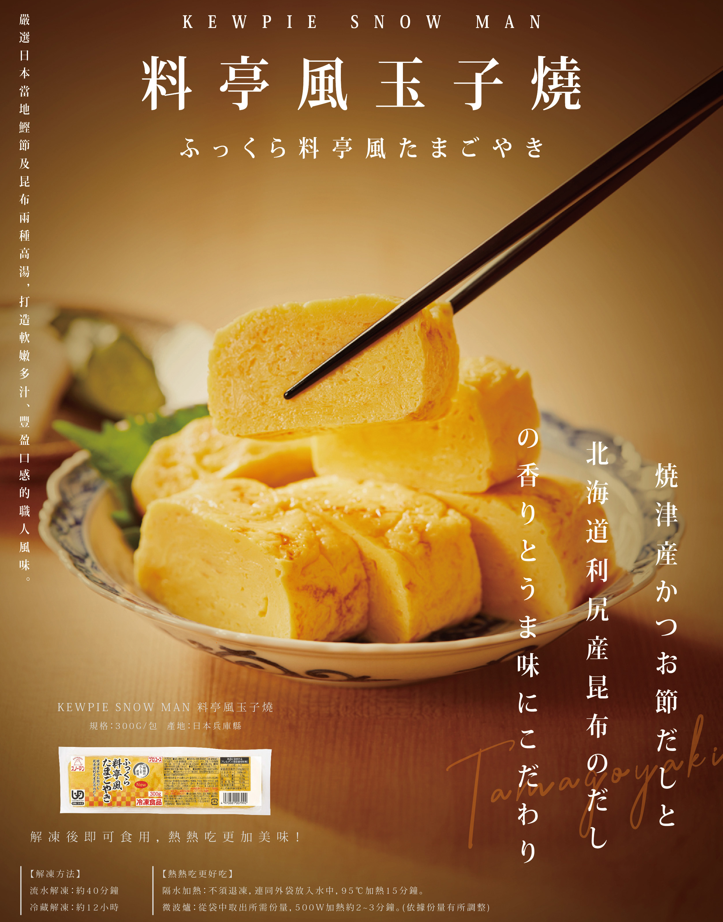 ● 簡單出餐、方便快速 解凍即可出餐,更可以做為夾入壽司捲或吐司中作為配料、更可以油炸後食用。各種變化應用讓雞蛋料理變得不簡單!